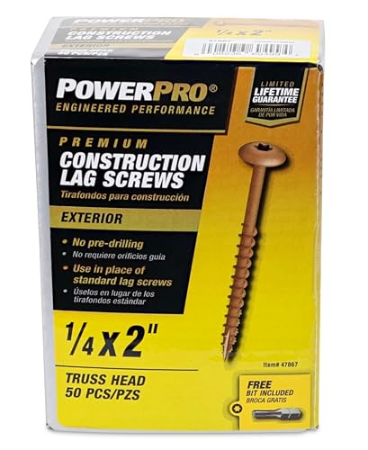 • Power Pro 47867 Construction Lag Screws, 1/4"-20 x 2", Epoxy Coated, Torx/Star Drive Included, Coarse Thread, Decking Screws, Outdoor Rust Resistant, Bronze, 50pcs