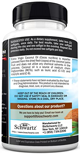 BioSchwartz Coconut Oil Capsules 2000mg - Organic Pure Extra Virgin Unrefined Cold Pressed MCT Rich & Non-GMO for Healthy Skin Nails Hair Growth Support Bloating Anti Aging Digestion - 120ct (2 Month Supply), 120 Count (Pack of 1)
