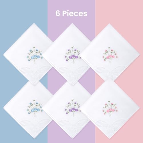 Selected Hanky Women's Cotton Handkerchiefs Flower Embroidered with Lace, Ladies Hankies 6 Pcs - Assorted