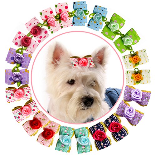 YOY 24PCS/12 Pairs Adorable Grosgrain Ribbon Pet Dog Hair Bows with Rubber Bands - Puppy Topknot Cat Kitty Doggy Grooming Hair Accessories Bow knots Headdress Flowers Set for Groomer