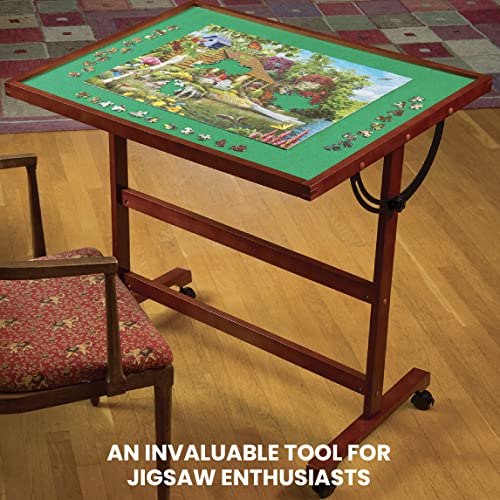 Create your own custom comfort with our innovative puzzle table. Just roll the Puzzle Tableau to your favorite spot and lock the swivel casters in place. Then turn the side wheels and tilt the table from flat up to a 40 degree angle to find the best position for you. The non-slip, felt covered working surface measures 86 cm x 63 cm to accommodate puzzles up to 1500 pieces – plenty of room to work on your favorite hobby as well. We've also included a convenient green felt cover to protect your puzzle in progress. Made of cherry finished beech wood. Fits a standard size chair. Assembly required. Includes step-by-step illustrated instructions, necessary hardware and assembly tools. Measures 90 cm wide x 67 cm deep x 83 cm tall when positioned flat.
