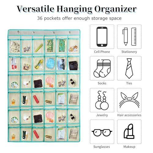 SAVORLIVING 36 Clear Pockets Classroom Pocket Chart Organizer, Cell Phones Calculator Holder with Hooks, Hanging Wall Door Calculators Phone Caddy (Beige)