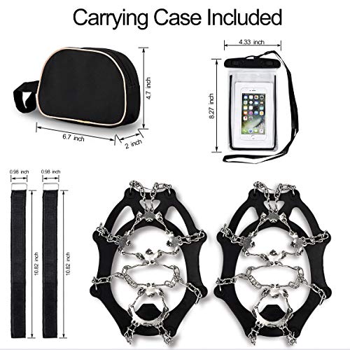Qerhod Traction Cleats,18 Tooth Stainless Steel Ice Snow Grips Anti Slip Crampons,Suitable for Winter Jogging,Hiking, Climbing,Other Outdoor Events-Includes Carry Bag/Waterproof Phone Pouch (Black/L), Black(Large size)