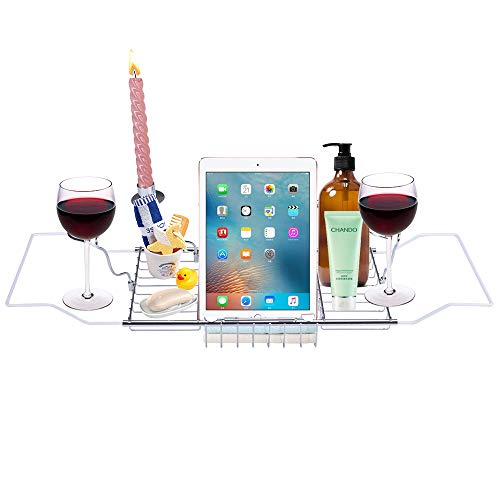 Suteck Bathtub Caddy Tray - Stainless Steel Over Bath Tub Racks Shower Organizer with Extending Sides, Removable Wine Glass Holders and Book Holder, One or Two Person Bath and Bed Tray, Silver Item Sku: