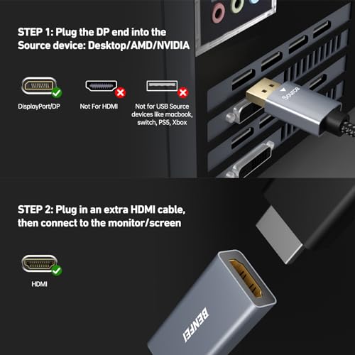 • BENFEI 4K DisplayPort to HDMI Adapter Cable, (2K 60Hz, 1080p 120Hz) Uni-Directional Display Port to HDMI Monitor Converter Compatible for HP, Dell, GPU, AMD, NVIDIA, More. Male to Female
