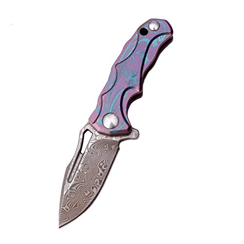 Samior HA013 Small Folding Pocket Flipper Knife,1.57" 9CR18MOV Acid Etch Damascus Style Blade, Purple Blue Anodized Titanium Handles, Thumb Slot Open Frame Lock, Mini Little Keychain Key Ring EDC Kniv