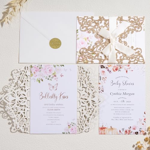 AdasBridal 50Pcs Glitter Floral Laser Cut Wedding Invitation Cards with Envelope Blank Inner Sheet and Ribbon for Wedding Engagement Bridal Shower Party Invite(7.09 X 4.92inch, Rose Gold) Item Sku: