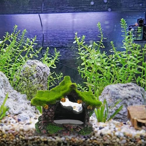 Tfwadmx Aquarium Decoration House Resin Hollow Hideout House, Betta Fish Hide Accessories Cave Ornament Tank Small Fish Hideaway with Moss