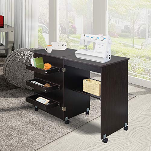 Usinso Folding Sewing Table Multifunctional Sewing Machine Cart Table Sewing Craft Cabinet Table with Storage Shelves Portable Rolling Sewing Desk Computer Desk with Lockable Casters(Dark Brown)