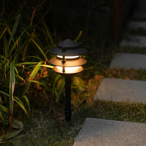 GOODSMANN Landscape Lighting 4PK Pathway Lights Low Voltage 2.2 Watt LED 12V AC Landscape Lights 30 Lumen Warm White with Cable Connectors Metal Stakes 9122-21102-04A, Black, 4 Pack Item Sku: