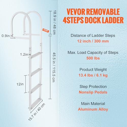 VEVOR Dock Ladder, Removable 4 Steps, 500 lbs Load Capacity, Aluminum Alloy Pontoon Boat Ladder with 3.1'' Wide Step & Nonslip Rubber Mat, Easy to Install for Ship/Lake/Pool/Marine Boarding