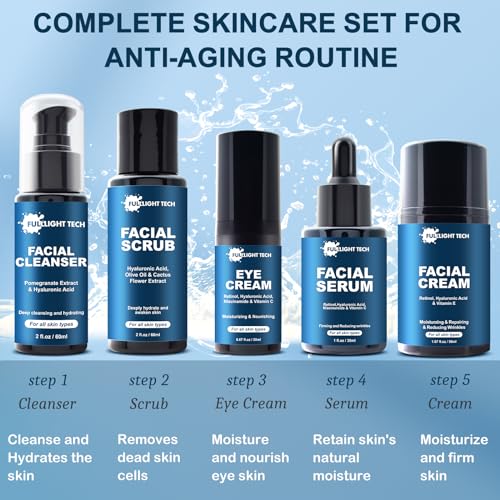 FULLLIGHT TECH Gifts for Men,Mens Anti Aging Skin Care Kit,Reduce Wrinkles & Hydrate Skin w/Facial Cleanser,Scrub,Cream,Serum,Eye Cream Unique Men Gifts Stocking Stuffers for Christmas,Gift for Him Boyfriend Husband, Blue Item Sku: