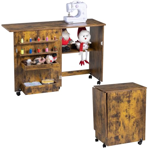 Vividwood Folding Sewing Table, Multipurpose Sewing Machine Table with Compact Design, Wheels, Shelves, Bins, Pegs, Magnetic Locks (Rustic-Brown)