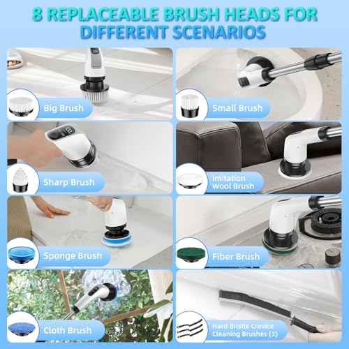 • Electric Spin Scrubber, IPX7 Waterproof Power Shower Scrubber with Extension Handle, 7 Replaceable Brush Heads & 3 Hard Bristle Crevice Cleaning Brushes Cleaning Supplies for Bathroom Tub Tile Floor