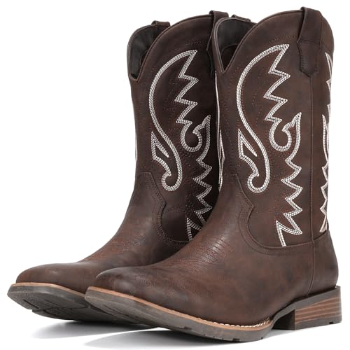 IUV Cowboy Boots For Men with Wide Square Toe Western Retro Boot Durable Classic Fashionable Embroidered Pull On Slip Resistant Boots