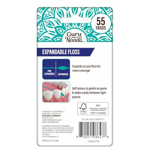 GuruNanda Expandable Waxed Dental Floss for Gentle, Deep Cleaning Wide Teeth Flossing - Peppermint Flavor - 55 Yards, White, 165 Foot (Pack of 1)