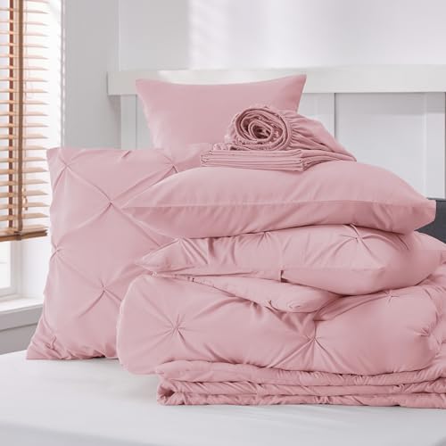 Bedsure Twin Comforter Set Baby Pink - Bed in a Bag Twin Size Bedding 5 Pieces, GentleSoft™ Pintuck Bed Set Gift for Family, Pinch Pleat Pink Comforter with Sheets, Pillowcase & Sham