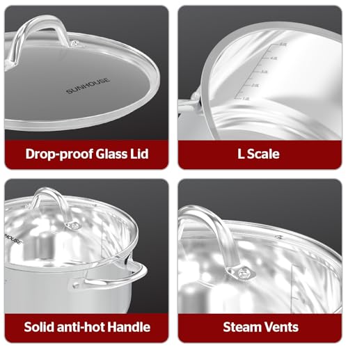 SUNHOUSE Stainless Steel Stock Pot - 11 Quart Heavy-Duty Induction Cooking Pot with Visible Lid for Pasta, Soup, Spaghetti - Nonstick Thick-Bottom Deep Stockpot for Canning, Boiling, and Simmering, 11 Quarts Item Sku: