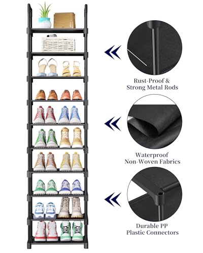 Kitsure Shoe Rack - 10-Tier Shoe Organizer with Detachable Fabric Shelves & Metal Frame, Tall Shoe Rack for Closet, Entrance, Living Room, 16.9" Wide - 10 Tier, Black