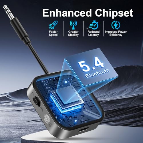 • 2025 Pro Bluetooth 5.4 Transmitter Receiver, 2-in-1 Wireless Audio Adapter for Airplane/TV/PC/Gym - Dual Link Headphone, Low Latency, Battery Display, Built-in Mic, 30H Playtime, Aviation Metal Frame