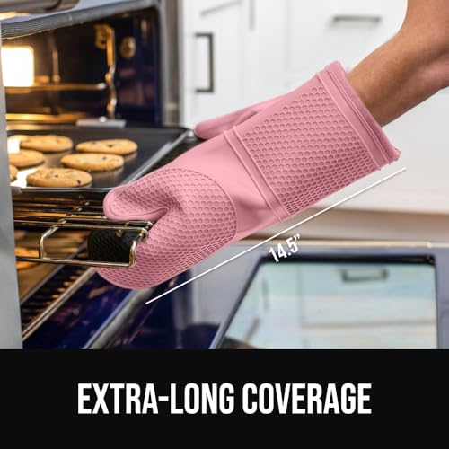 GORILLA GRIP BPA-Free Soft Silicone Oven Mitts, 14.5x8.3, Heat Resistant and Waterproof Cooking Gloves, Thick Cotton Lining, Flexible Gripping for Baking Grilling, Kitchen Potholders Set of 2, Pink, 14.5" Oven Mitts