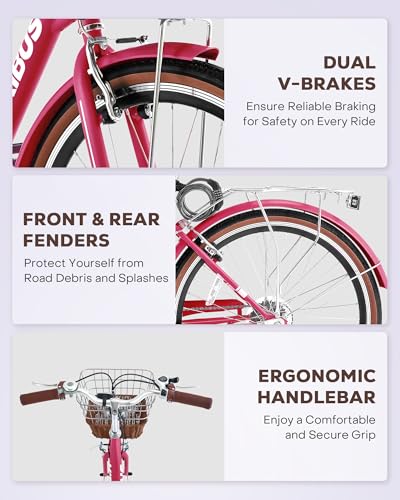 Viribus Womens Bike, 7 Speed Bike for Adults with Ratten Basket 26 in, Beach Cruiser Bike for Women, Bicycle for Commuting, Female Step Through City Bicycle for Ladies Seniors Fushia 330 lb. Item Sku: